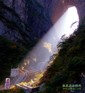 中國(guó)最高的自然“天門(mén)洞” 公元263年即三國(guó)吳永安永安六年時(shí),吳王孫休見(jiàn)其高峻雄偉,巍峨壯觀,便將武陵郡分置天門(mén)郡,從此天門(mén)冊(cè)名傳遐邇,譽(yù)貫古今。天門(mén)洞周圍簇涌著丹灶,老僧、玉壺、玉堂、金匱、筆架、將軍、箭桿、漆圓、弩牙、猿點(diǎn)、天姥、負(fù)兒、簸箕、雞籠、高遠(yuǎn)等16座山峰,其間又鑲嵌著雷、電、風(fēng)、云、泥、蛇、龜、祖師、玉皇、鬼谷、果老、玄天、合山、求兒、鐘鼓、老龍等16洞府,幽默盤(pán)亙,使得天門(mén)山在雄偉之中又增添了神奇和秀麗。流水清洌的澧河為天門(mén)山頻映倒影,寬廣低平的田疇為其鋪就如茵綠毯,繁茂的森林裝點(diǎn)著山基和山頂,淡云薄霧為她峨冠霞佩,朝暉夕照為她斜染紅裝。隨著四季的更替,她春茵夏碧秋金冬縞,呈現(xiàn)出無(wú)窮的變幻。天門(mén)山生態(tài)系統(tǒng)給天門(mén)洞的神奇增添了新的魅力。 據(jù)說(shuō),天門(mén)洞開(kāi)景區(qū)的有上天梯。有著九百九十九級(jí)臺(tái)階的上天梯!